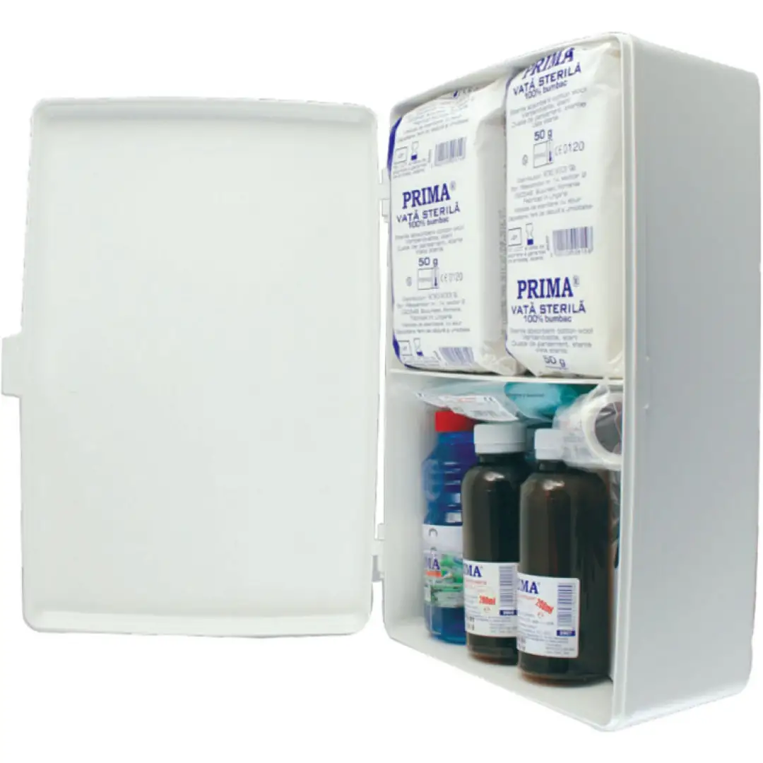 Trusa de prim ajutor fixă se montează pe perete și conține materiale medicale de bază